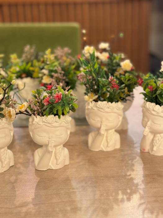 Disponibil în două variante: Cu aranjament floral artificial sau flori uscate natural – flori atent alese, în tonuri calde și naturale Fără aranjament – perfectă pentru DIY sau ca mini-ghiveci