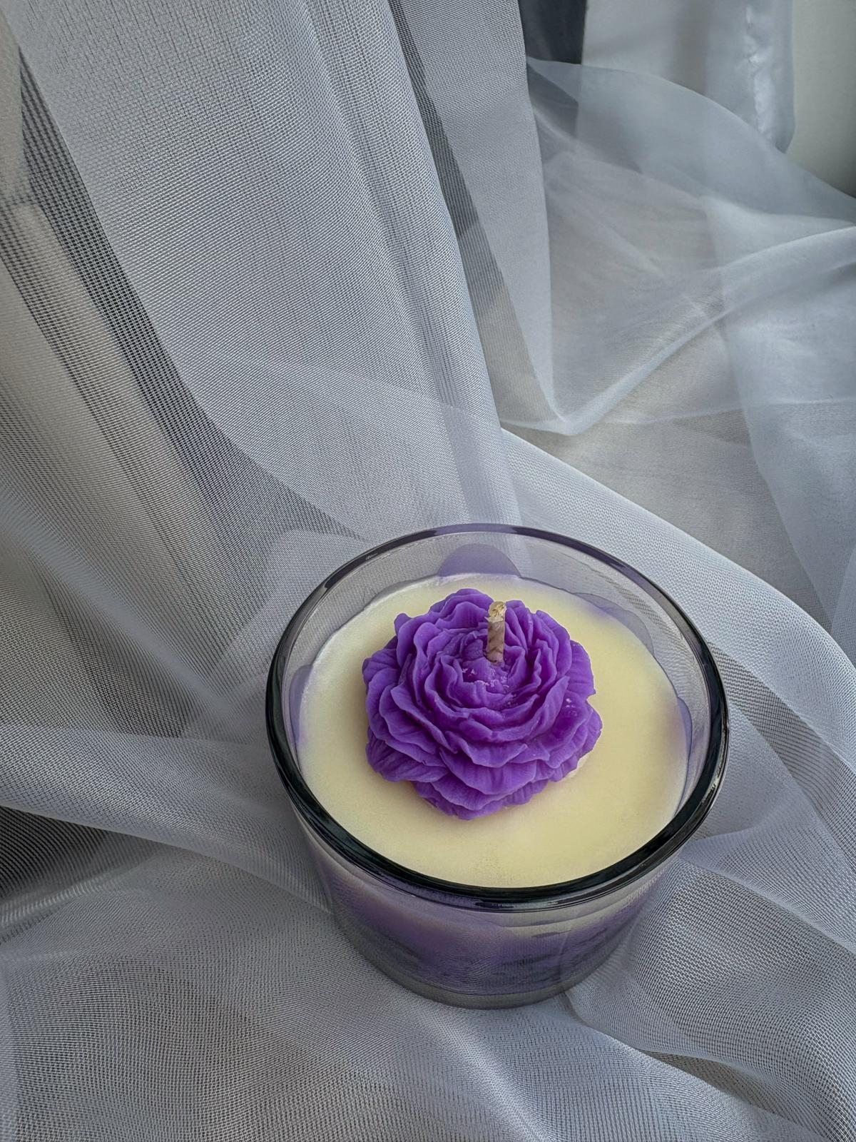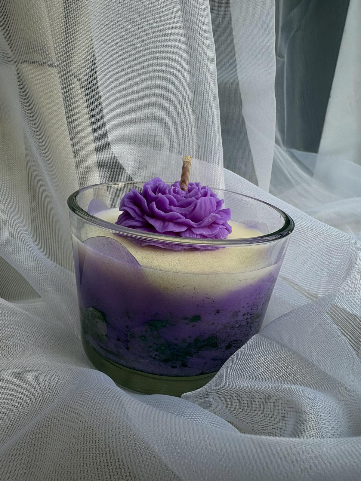 Lumânare handmade parfumată cu aromă de vanilie, cu design floral elegant în nuanțe mov.