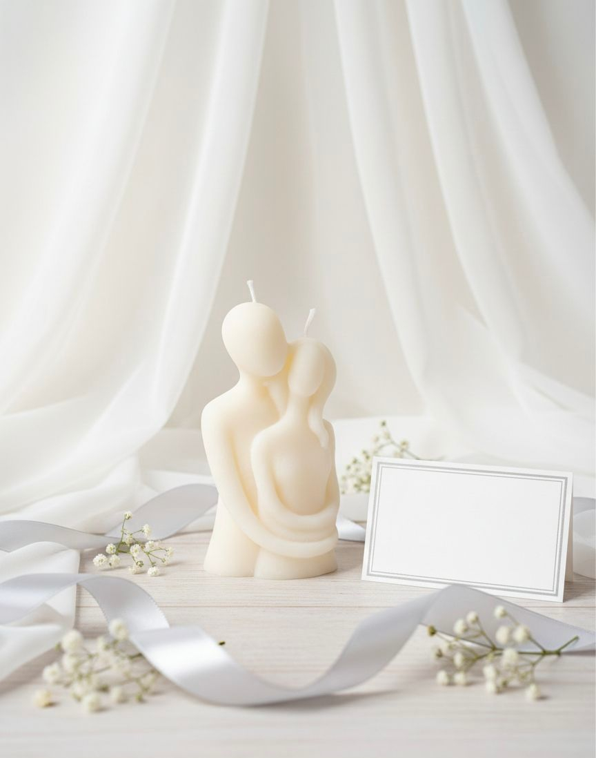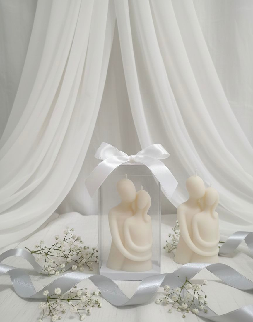 Mărturie de nuntă tip lumânare cuplu, realizată manual din ceară naturală de soia 100%, ecologică și prietenoasă cu mediul.